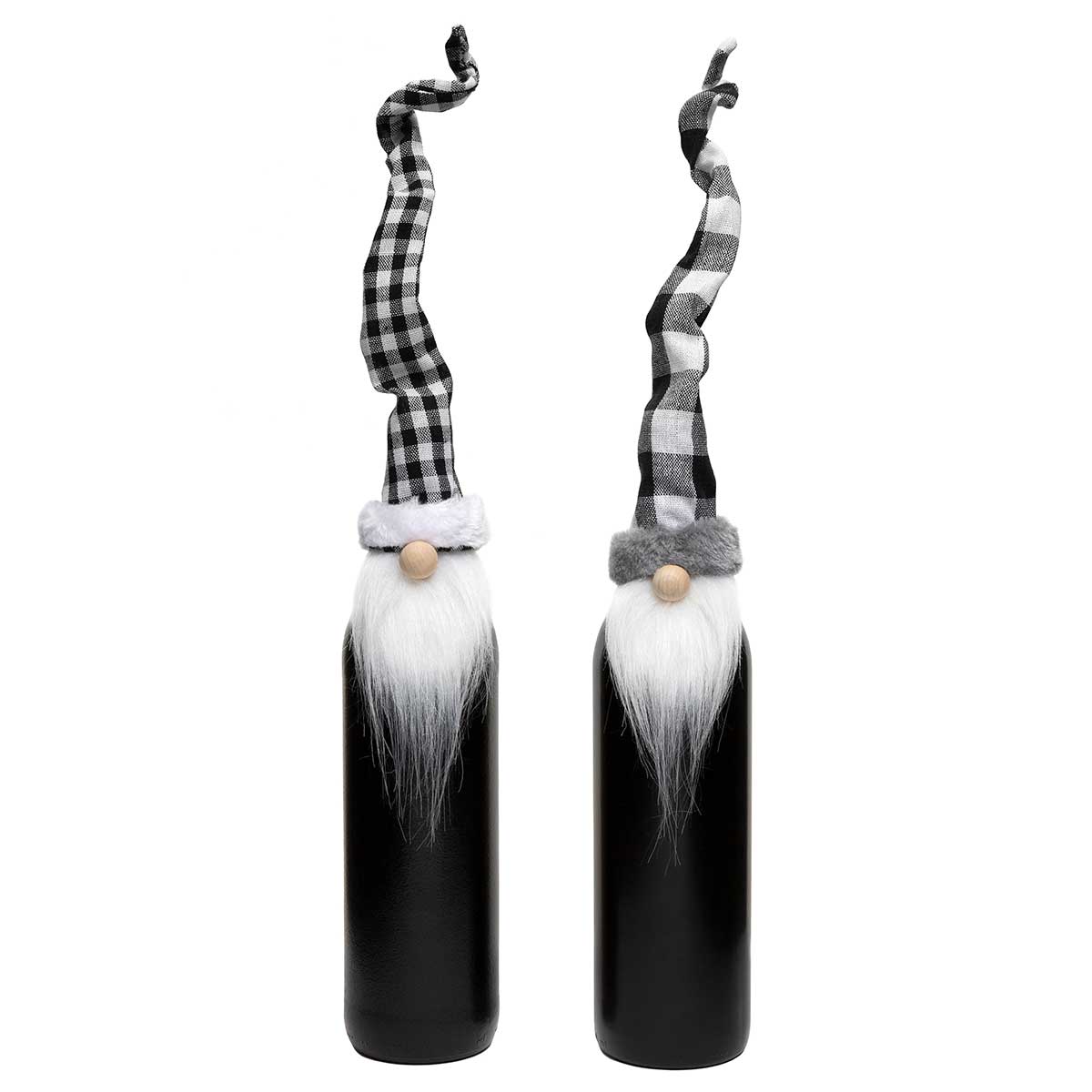 GNOME BOTTLE TOPPER BLACK/WHITE PLAID WITH WIRED HAT, WOOD NOSE AND WHITE BEARD 2 ASSORTED